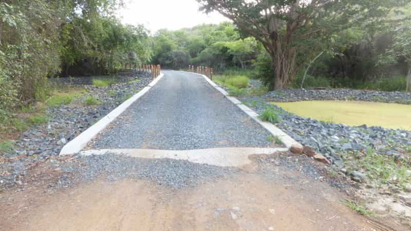 In this picture a newly constructed gravel road in Puerto Rico has a “speed bump” that stops water from washing out the road as it comes downhill. The coarse gravel in the road allows rainfall to soak in and the concrete edges hold the gravel in place. Water from up hill and the road goes to small ponds on either side of the road where water can soak in. This road had just been completed and you can see by the color of the water that the pond on the right intercepted a large amount of suspended clay particles that would have otherwise gone into the ocean that is just a short distance away.
